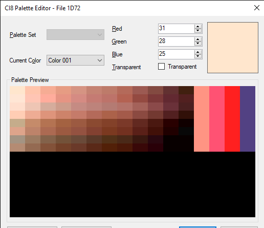 Here is what the 256 palette looks like. The first row of 16 is the palette that is used for color 1. The first 16 colors are the only ones that should be used in the face graphic no matter what the default palette for the character is in game. That is because the following 7 rows of 16 represent colors 2-8. The final 128 are unused, and all 0,0,0 but they are necessary for the 256 color palette needed.