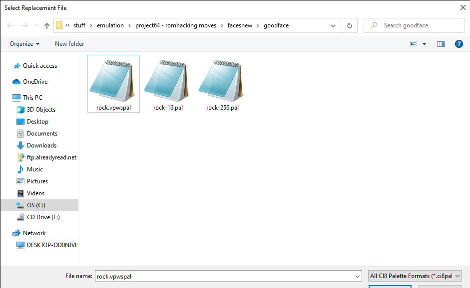 Now the prep work. Open VPW Studio, load your project file, and go to Project -> File Table and go to the face textures starting at 1D72. Click on any Ci8Palette twice. It doesn't matter which, but make sure you use the same source for this whole process.