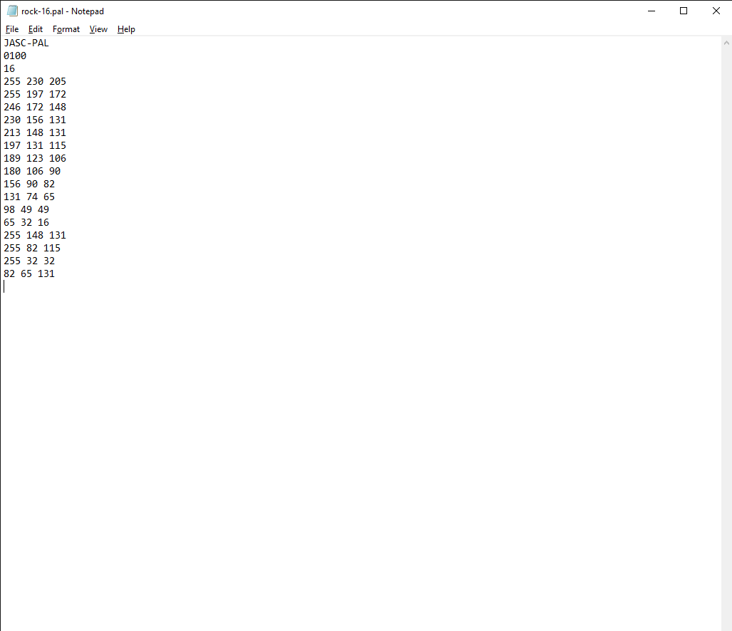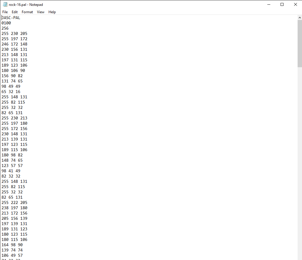 The reason I have exported two PSP palettes is that I want to have the colors for the file I am saving defined from 1-16. Any one defined as another color will look awkward in game. Since PSP palettes are text files, they can be easily edited. Go to paletterock-16.pal.